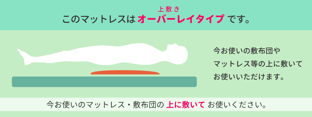 ハッピーそよかぜは、 今お使いの布団やベースマットレスの上に敷いて使う、 オーバーレイタイプのマットレスです。